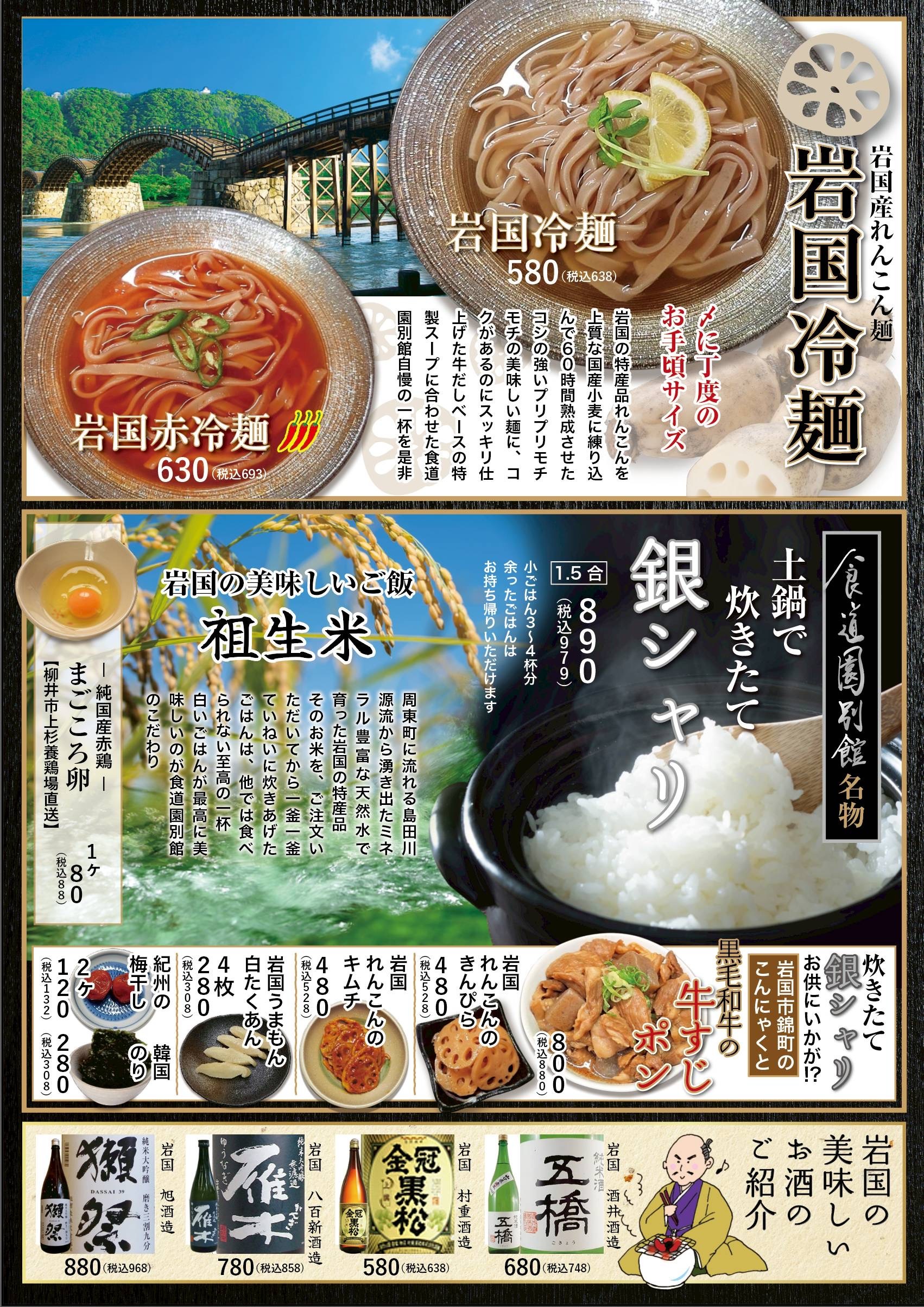 岩国特産品の蓮根を上質な国産小麦に練りこんで、60時間熟成されたモチモチ麺に、コクがあるのにスッキリ仕上げた冷製スープを合わせた、当店オリジナルの岩国冷麺と、