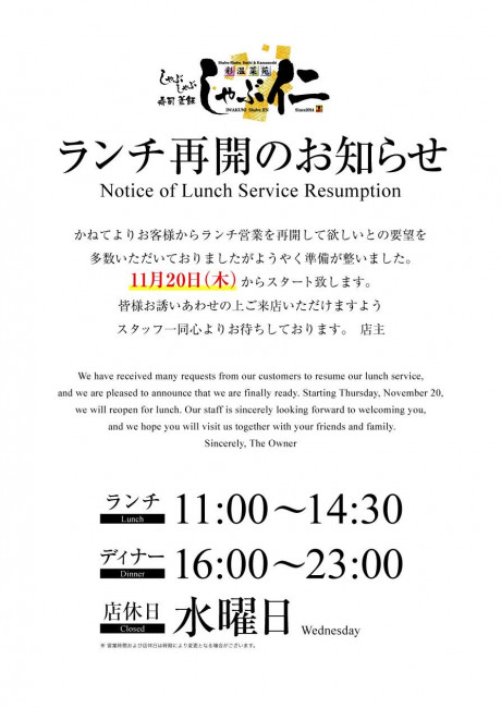 しゃぶ仁と食道園 南岩国店 より、皆様にお知らせがございます。